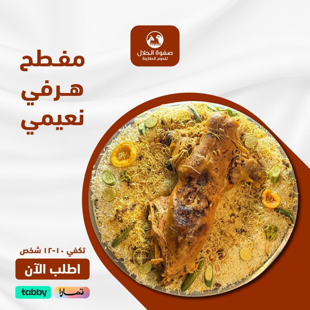 ابدأ عزيمتك بخيار فاخر يعكس كرم الضيافة السعودية مع مفطح هرفي نعيمي بلدي من صفوة الحلال. لحم طري محضر من أجود أنواع النعيمي البلدي، مطبوخ على نار هادئة مع الأرز الشعبي الفاخر ومزين بالمكسرات والخضار، ليمنحك طعمًا أصيلًا يليق بمناسباتك.